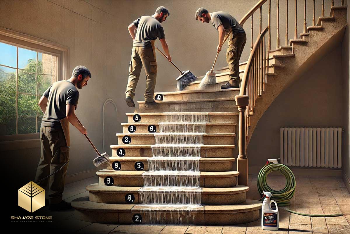 - تمیزکاری منظم: به صورت منظم سنگهای راه پله را تمیز کنید تا از تجمع آلودگیها و لکههای سرسخت جلوگیری شود. این کار باعث حفظ زیبایی و دوام سنگ میشود.